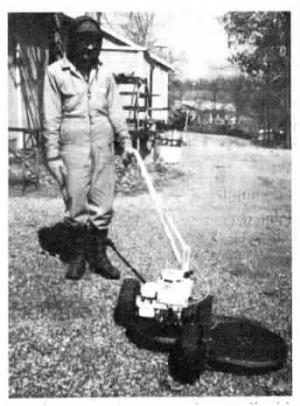 "I built it to keep the electric fence surrounding my apple trees free of weeds. It makes the job easy and is fun to operate," says Harold Smith, Muscatine, Iowa, about his unusual double-decked fenceline mower fitted with a "one-hand" handle.