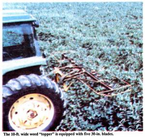 Vincent Kramper, Dakota City, Neb., built a 3-pt. mounted "corn and weed topper" equipped with rotating blades that clip off volunteer corn and tall weeds just above the tops of his soybeans.