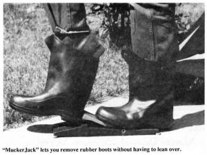 The "MuckerJack" boot remover has a 16-in. long, 4 1/2-in. wide polypropyleneand-fiberglass step-on base with a 6 1/2-in. long spring-loaded plate mounted in the middle. Four rubber pads under the base keep it from slipping. The front of the spring-loaded plate is rounded to fit the heel of a boot. You place the heel of the boot to be removed on a serrated surface-grip on the base, step down on the plate with your other foot, and pull your foot out of the boot.