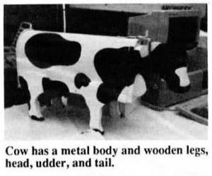 The cow has a metal body and wooden legs, head, udder, and tail. A cowbell hangs around its neck.