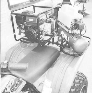 He recently sent FARM SHOW a photo of a Yamaha 350 4-wheeler with a Honda 2,500-watt generator and a Puma 1,400-watt compressor and 3-gal. air tank mounted on the rear rack. Tie-down straps are used to secure the generator and compressor to the rack.
