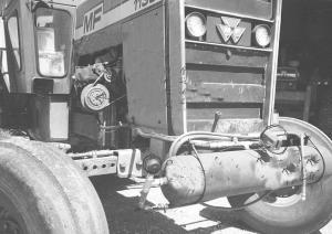 "We built the first one out of odds and ends five years ago and it worked so slick, we've put them on two more of our tractors by this time," Franklin says. "We started with a single-piston air compressor we got out of a junked Ford car. We mounted it on a bracket we made out of scrap iron and bolted it to the tractor frame near the alternator so the compressor could be belt driven off an existing extra pulley on our Massey tractors. We mounted a 7-gal. air tank off the air brake system from an old semi tractor/trailer on front of the tractor and plumbed the intake side, which is fitted with a small filter, underneath the hood and the pressure side to the tank with hydraulic hose. We installed a 1/4-in. dia. ball valve just before the pressure hose to prevent air leaking out loose chucks. We installed a pressure gauge on one end of the tank so we can see from the cab the amount of pressure in the tank. We in-stalled an electronic automatic pressure switch on top, which connects with a switch in the cab we use to turn the unit off and on.