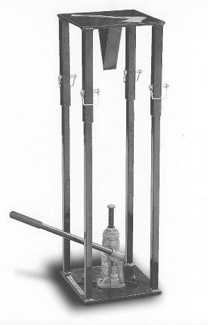 The "Hatchet Jack" is 12 in. square and and 42 in. high so you can keep it on a patio or deck. It's equipped with a wedge on top. You just set a log on top of the jack and pump the handle to split it.
