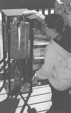 "It's much safer than an axe or powered splitter and it doesn't take up much room so you can keep it handy to use whenever you have time," says Bill Green, inventor. "I came up with the idea because I didn't want my kids to risk hurting themselves using a hatchet to split firewood. It'll take logs up to 9 1/2 in. in diameter. The jack raises 9 inches. Once you determine where to mount the pins in the legs you can use the jack's screw to make the final adjustment. On most jacks the screw can be raised about 3 1/2 inches."
