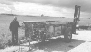 He started with a Knight 250-bu. spreader that already had the beaters removed. He removed the pto shaft and shortened up the pto drive chain that originally operated the apron, then mounted a hydraulic motor on front of the spreader. The motor drives the apron. To power the spreader û and the splitter on back - he mounted a 12 hp, electric-start gas engine equipped with a 2-stage hydraulic pump on the tongue.