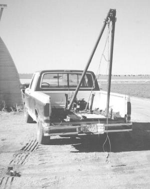 The winch attaches to the pickup's gooseneck hitch and consists of a steel frame that supports a pair of gin poles. A homemade electric winch, consisting of an automotive flywheel driven by a starter motor, mounts on the front part of the frame and connects by cable to the top of the poles. The winch is controlled by a friction brake. Both poles pivot at the bottom on the frame and extend forward when not in use.