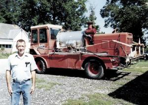 I converted a salvaged fire engine truck into a 4-WD self-propelled field sprayer. It looks a little odd going through the field, but it works. The truck is powered by a 6-cyl. Caterpillar engine that's mounted at the rear and has a 4-speed automatic transmission. It originally had a big, clumsy 6-passenger cab which I replaced with the cab off a Massey Ferguson tractor. I also removed the truck's original 400-gal. tank and replaced it with a 500-gal. stainless steel tank. The tank is pressurized by an air compressor that's belt-driven off the engine. There's also a 30-gal. foam marker tank. A local manufacturer custom built a 44-ft. boom which I bolted onto the back of the rig. It has a lot of power and will keep going in soft ground where a pickup sprayer would bog down.