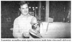 "Signamail" consists of a transmitter that mounts on the mailbox door, and a receiver inside the home. A green L.E.D. light on the receiver lights up and a short song is played the moment the mailbox door is closed. When you pick up your mail, you press a reset button so it's ready for the next delivery. It transmits a signal over 500 ft.