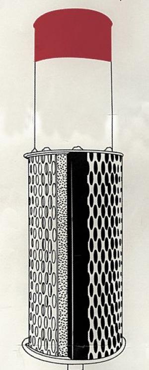 The unit measures 36 in. high and 10 in. in diameter and is made from aluminum. Flotation foam inside the unit causes it to float. The bottom 24 in. is perforated and is equipped with a 1-in. dia. polyurethane element that works as a filter to remove most particles commonly associated with pump or valve problems. Because the element is made from polyurethane, it is washable and can be reused. The element will filter out almost all separate visible particles. If the water being filtered has dissolved mud in it, the discharge may be cloudy but small particles which tend to clog nozzles, valves, sprinkler heads or pumps will be trapped inside the element.