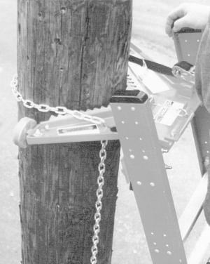 It's equipped with spike bars that grip trees and poles. A pair of hinged, round pads, at either end keep the ladder from sliding on flat surfaces. A built-in ratcheting nylon strap or chain hold-down fastens the ladder even more securely to trees and poles.