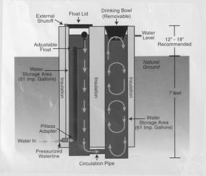 The waterer consists of two lengths of heavy polyethylene pipe buried side-by-side vertically at a depth of 7 ft. Both pipes, which act as reservoirs, are well insulated with urethane. One is topped with a removable drinking bowl. The other is plumbed to the water pressure line and contains a float valve to control water flow into the system. Both vertical pipes are plumbed together at the bottom. Each holds 61 gallons as shipped. Warmer water rises to the surface while cooler water settles back to the bottom of the pipe, where it is warmed again. This creates enough circulation to keep water temperatures at the surface above freezing.