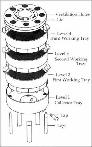 The roundworm bin consists of three working trays and a bottom collector tray with a tap to drain off liquids. Coconut husk bedding material provided with the unit is placed in the bottom of the first working tray along with dirt or compost and some organic matter. Organisms in this material will begin the composting process, which the worms complete. As the worms consume organic matter and the first tray fills up, a second working tray is added and the process is repeated as the worms migrate up and into the next tray. Once the third working tray is full of compost, the bottom working tray can be emptied of castings, prepared with bedding material and placed on top of the other two.