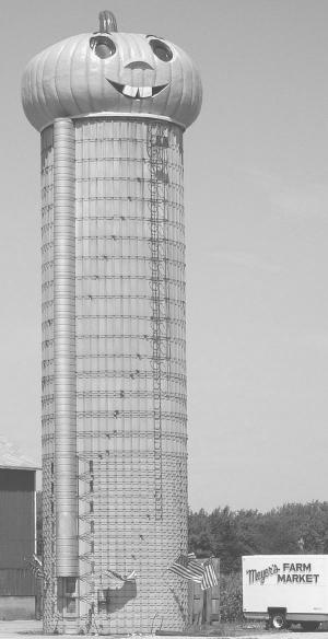 Bryan Meyer came up with the idea for the pumpkin, which measures 22 ft. dia. and over 14 ft. high. He put it on top of an unused silo.