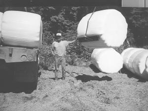 "I figured we could handle the plastic-wrapped bales if we could make pads to fit over the tongs," he says.