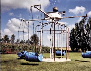 The ride consists of four 30-gal. plastic barrels suspended from 10-ft. long horizontal steel arms. The barrels are attached by lengths of chain to the end of each arm and go "flying" as the arms rotate.