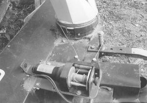 He bolted the winch on top of the blower and ran a cable from the winch around the spout. A 7/16-in. bolt with a 1/2-in. pipe on it is used to guide the cable. A 12-volt switch in the cab is used to control the winch.