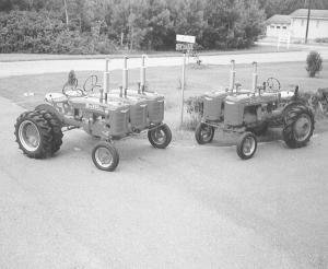 "It was a lot of fun to build and always draws a lot of attention wherever it goes. My son Casey helped me build it," says Stewart. "It makes a great parade tractor, and we really enjoy taking it to tractor shows and listening to people try to figure it out. It's surprising how many people ask me what year Farmall made this type of tractor. At shows I often crank one engine up, then put the other two engines in gear and let off on the clutch and drive forward to start the other two engines up.