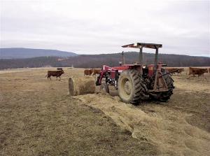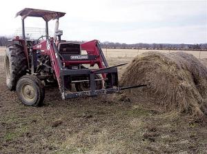 "The spike sticks out to the left of the loader," Yandell says. "Once you set the bale down with your center spike, you back your tractor up, turning just to the right of the bale until you are in line to spear it in the center with the side spike when you move forward again. With a little downward pressure from the spike, the bale starts unrolling as you move ahead. If you come to a wet spot, you can lift the bale up and set it down again where it's dry, or if you want to unroll only part of a bale, just lift it up and take it somewhere else."
