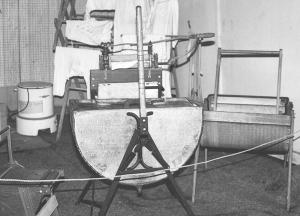 One machine is equipped with a wooden half barrel and a mechanical metal wheel, with a "dasher" inside the barrel. As you push and pull on a handle it causes the dasher to go back and forth as well as up and down.