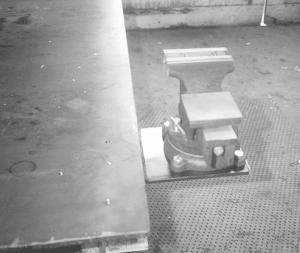 "We came up with the idea when we put a new 6 by 4-ft., 1/2-in. thick welding table in our shop," says Fratzke. "We wanted a vise on the table, but we didn't want it mounted on the table top because it would sometimes interfere with our welding projects. So we welded a piece of 8-in. sq., 3/8-in. thick metal plate to a 20-in. length of heavy duty sq. tubing. We drilled three holes in the plate so we could bolt the vise on, and also drilled a hole in the sq. tubing.