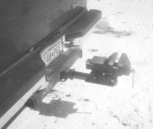 Quick-Detach Vise FARM SHOP Tools 29-3-36 Harold Fratzke recently called FARM SHOW to tell us about a nifty "quick-detach" vise mounting bracket that he came up with. It lets him mount a vise alongside his welding table - leaving a clear table top - or on back of a pickup in the receiver hitch.