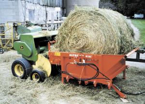 The Altec 160 bale unwinder is made in France. It can handle bales up to 4 ft. wide and 6 ft. in diameter that weigh up to 2,200 lbs. The St. George Company imports the machines and modifies them so they'll unwind bales directly over the pickup reel of any small square baler. They added four steel legs to the machine and also added an on-off switch on one side of the machine. The legs put the bale 4 ft. off the ground where it's high enough to unwind into the baler's pickup reel. A manual control is used to set the speed at which the bale unwinds.