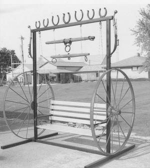 "The swing has hay rake wheels on the side, horseshoes across the top, a pair of hames on the top corners, and a couple single trees directly over the swing."