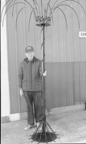 "The metal palm tree has a disc blade for a base and hay rake tines for branches. The trunk is a piece of pipe wrapped with a steel rod.