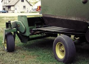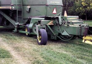 The baler is supported by a pair of large caster wheels off an old Prasco air seeder. The caster wheels keep the baler following in a fixed position directly behind the combine, even on turns.