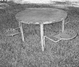 The table has an expanded metal top that's welded to a 4-ft. dia. steel wheel rim off the cultivator. The table's four legs are made from 2-in. dia. steel pipe and have another steel wheel rim welded to their bottom. The legs are fitted with four metal seats that mount on brackets made from pieces of 3/4-in. dia. sucker rod, which fit inside sleeves welded to the legs. The brackets are free to swivel inside the sleeves, allowing the seats to be swung from side to side.