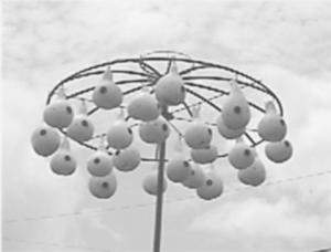 The satellite dish - with all the mesh screen stripped away from it - mounts on a 1 1/2-in. dia. pole about 17 ft. above the ground. The gourds are attached by short lengths of wire to the dish's frame and are spaced about 3 ft. apart. The dish can be quickly raised or lowered from the ground by turning a crank attached by cable to a 2-ft. length of pipe welded to the center part of the dish. The cable runs over a pulley at the top of the pole.