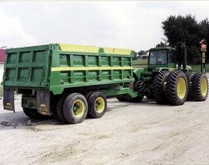 We turned a 40-year-old Chevy truck into a 16-ft. dump trailer that can carry a load of 15 tons. The tandem axle trailer dumps hydraulically, powered by tractor hydraulics. The front of the truck frame was formed into a drawbar hitch. To handle the heavy trailer, we built a special drawbar hitch for the tractor that links to the top link of the 3-pt. The top link runs down to the hitch to provide extra support.