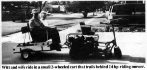 Witt and his wife ride on an old bus seat mounted on a small 2-wheeled cart that trails behind the 14-hp. mower. The tractor has hydrostatic drive so a single pedal controls forward and reverse. He rigged up a foot control by running a rod from the tractor's foot pedal to the back of the tractor. He then attached short lengths of chain to either side of the handle bar type steering handle and ran leather reins back to the trailer-mounted seat.