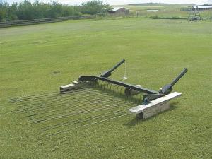 The Whole Buncher looks like a giant pitchfork that attaches to the combine's back axle and operates on a system of counterbalance. When about 40 to 50 lbs. of straw and chaff pile up on the tines, it tips, and the pile falls to the ground while the device springs back to its original position.