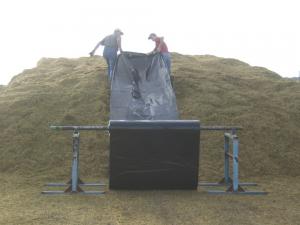 Easier Way To Unroll Silage Plastic HAY & FORAGE HARVESTING Forage Handling 30-5-17 To make the job of covering our silage pile with plastic a lot easier, we used a device borrowed from a friend. It's a set of steel welding sawhorses that he made with sets of caster wheels on top. It turned out to be very handy for rolling out silage plastic.