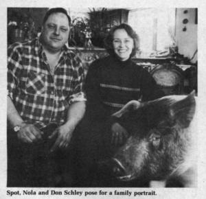 "Spot", a 430-lb. barrow, has complete run of the Schley's 5-bedroom country home. They got him last August when he was an innocent looking, 4-week old, 12-lb., mixed-breed porker. His name's derived from the single black spot he has on his other-wise red and white body.