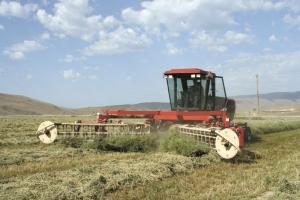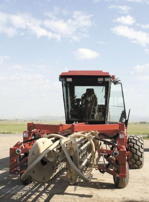 The swather-mounted rake is also fuel efficient. "The engine generally runs at about half throttle, which is plenty for the drive," says Bootsma. "It uses about half the fuel used for swathing."