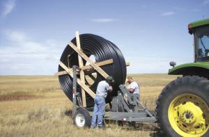 His tractor-mounted plow cuts up to 2 ft. into the ground as its reel lays in pvc water pipe from a spool. A maximum of 2-in. dia. pipe can be used, but Hagen says 1 1/2-in. pipe, which comes in 6,200-ft. rolls, was the most common choice. At the time, it cost between 42 and 45 cents/ft., but he says it's probably now closer to the 50-cent mark.