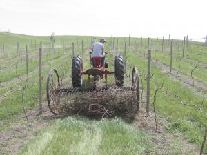 Yearly pruning of grape vines is essential. For the past four years, the Nissen's have used their modified rake to clear clippings from the vines out of the vineyard.