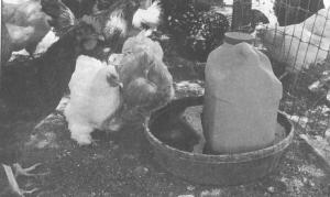 In the summer the jug tends to grow green algae, which the chickens love to pick out of the water when the jug has been rinsed and the algae flows out into the pan.