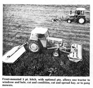 "There is virtually no limit on the number of front and rear equipment combinations that can be used with the new system," explains Harkness. For example, you can windrow hay up front and bale it in the back, prepare the seedbed and plant in one operation, spray up front and plant or till behind, or gang mow with one mower up front and two offset on each side behind.