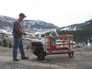 The 3-wheeled carrier is powered by an old 4 hp engine off a Bobcat snowblower that Barton wasn't using any more. He removed the blower parts and welded a 3-ft. sq. frame from 1 1/2 in. angle iron. He used expanded metal for the floor and leftover fir boards for the removeable sides. The single caster wheel on front is located about 4 ft. ahead of the snowblower's rear wheels.