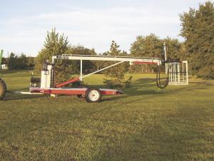 The cherry picker mounts on a 12-ft. long, 2-wheeled trailer and is equipped with three hydraulic cylinders, all of them operated by a 1 hp electric motor that can be plugged into any 110-volt, 15-amp household outlet using a 100-ft. extension cord. The largest cylinder raises and lowers the main boom. A second cylinder is used to extend the basket out 4 ft. The third cylinder is located under the trailer and is hooked up to a linkage system, allowing the boom to be rotated up to 45 degrees to the left or right of center. By adjusting the linkage, Verbeek can rotate the boom even farther to the left or right.