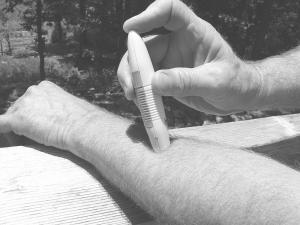 The battery-powered Itch Soother is about the size of a fat cigar. A small red button on one end activates the "hot plate" at the other end. Press the heating element against a bite and wait to feel the heat. A small yellow LED light comes on when the button is pushed. When the target temperature is reached, a green light comes on.