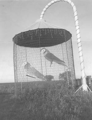 The parrots measure more than 8 ft. long and each was made from an 8-ft. sheet of plywood. Each parrot has a small hook attached to it and is held upright by a pair of guide wires that extend through the bin.