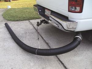 Binion keeps the pipe on the garage floor so that it's between the pickup's wheels as he drives in. A bungee cord is attached to the middle part of the pipe. Before he starts up the pickup to leave the garage, he slides the pipe over the pickup muffler, then hooks up the bungee cord to the receiver hitch to support the pipe. As he backs up, the pipe slides along the floor. Once he's on the driveway, he disconnects the pipe from the muffler and puts it back on the garage floor.