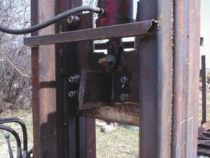 To mount the blade, Inkster fabricated a reinforced arch above the output end of the feeder channel. He used sections of 1/4-in. thick, 3 by 4-in. rectangular steel tubing with curved ends. He welded them together at the peak to form a mount for the heavy-duty hydraulic cylinder that drives the blade.