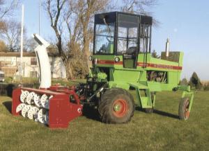 He bought a 1960's Owatonna 260 swather for $900. It was equipped with a Ford Industrial 200 cu. in., 6-cyl. engine with 70 hp. He narrowed the axles by 40 in. to match his mower and snowblower. He made his own cab, using safety glass for the windshield and plexiglass for the side and back windows. He made his own 3-pt. hitch and mounted it on the snowblower. The power shaft was lengthened about 10 in. to reach the swather and snowblower shafts.