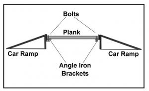 Delbert E. Hayes, Norwalk, Iowa: "I came up with this handy device to change oil or gearbox fluids in my 4-wheelers. I start with 2 pairs of car ramps and weld a 2-in. angle iron onto each one. Then I drill holes into the angle irons and bolt on a 2 by 10-in. plank between the ramps. I just drive on, change the oil, and drive off. If I want I can work from a creeper placed under the plank."