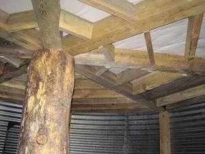 After assembling the bottom 8 ft. of the bin walls in the large hole, Brodie bolted 6 by 6 by 8-ft. tall support posts to the footings. He then attached floor joists and lateral braces from the top of each post to a 16-in. dia. hub log at the center. The 2 by 6 floorboards screwed to the joists tie the whole support structure together.